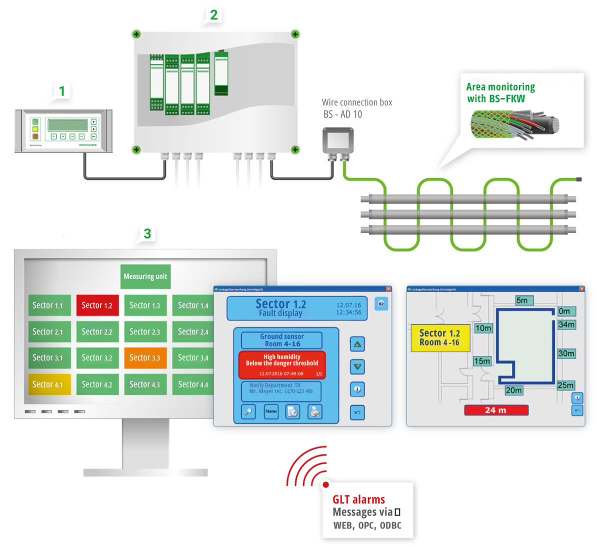 BS-FluidGuard makes it possible to detect the potential formation of moisture at an early stage. Protect sensitive rooms with water-bearing pipes to avoid costly damage. FluidGuard reliably locates moisture and leaks with pinpoint accuracy. By combining cost-effective yet highly sensitive sensor technology with Brandes' many years of experience and special software tools, it is possible to protect your investment permanently and reliably.