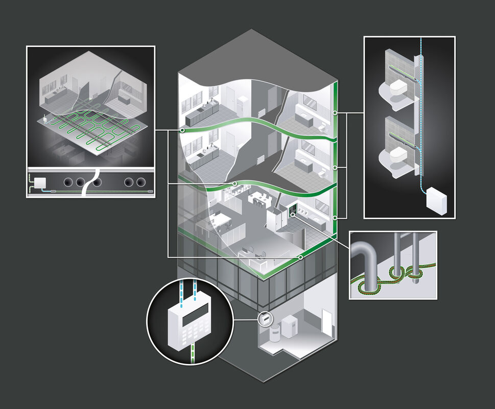 Frühzeitige Erkennung und Lokalisierung von Wasserlecks über mehrere Büroetagen hinweg, um Betriebsausfälle und Bauschäden zu vermeiden – bei gleichzeitig höchstem Anspruch an Design und Integration in die Gebäudetechnik.